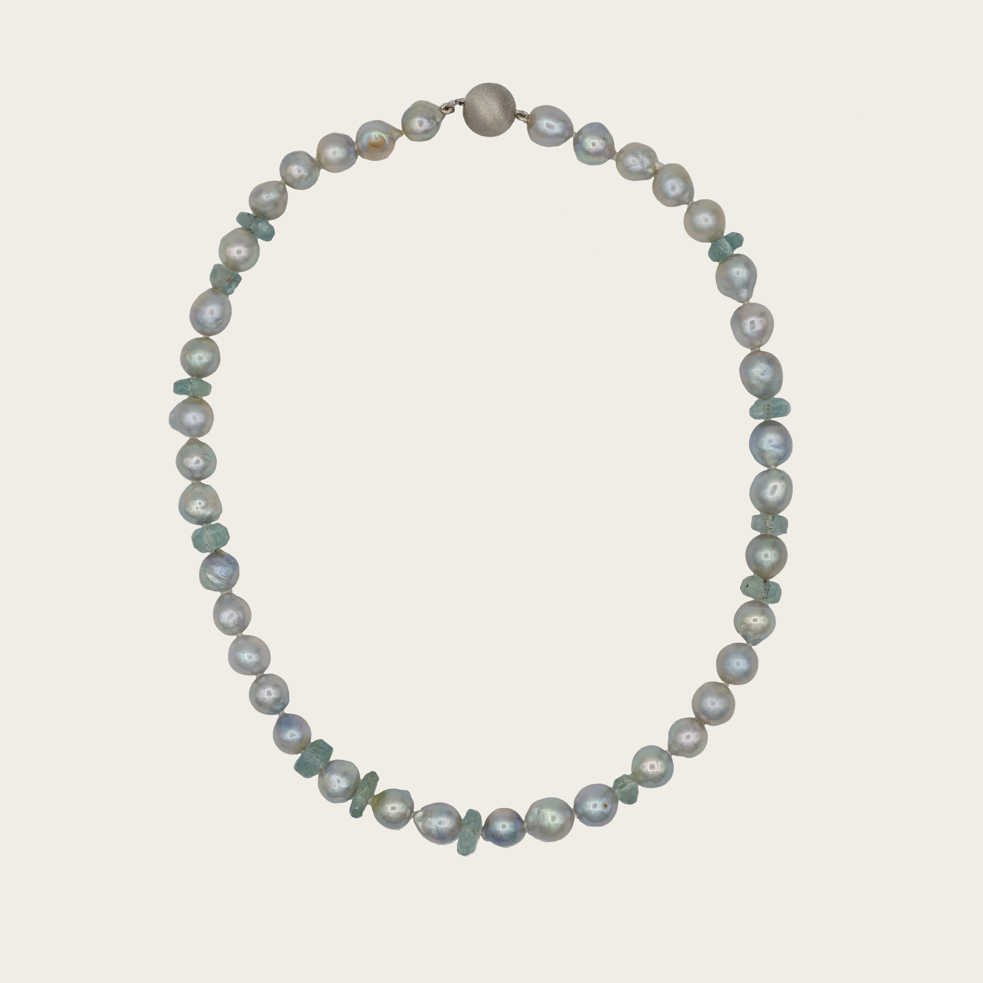 Diese Kette beeindruckt durch ihren natürlichen Glanz und die feine Abstufung der schimmernden Akoyaperlen. Zarte Aquamarine setzen einen sanften Farbakzent und verleihen dem Collier eine moderne, frische Note.