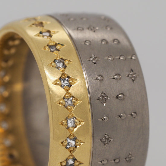 Die Materialität des Rings ist bewusst zweigeteilt. Eine Hälfte besteht aus Platin, dessen kühle, zurückhaltende Erscheinung für Dauer und zeitlose Stabilität steht. Die gegenüberliegende Hälfte ist in Gelbgold ausgeführt und bringt Wärme, Licht und Energie in das Objekt. Diese klare Zweiteilung ist Ausdruck der konzeptionellen Dualität: Erde und Himmel, Materie und Licht. Im Zusammenspiel mit den weißen Saphiren entsteht ein ausgewogenes Spannungsfeld, das beide Pole gleichwertig miteinander verbindet.