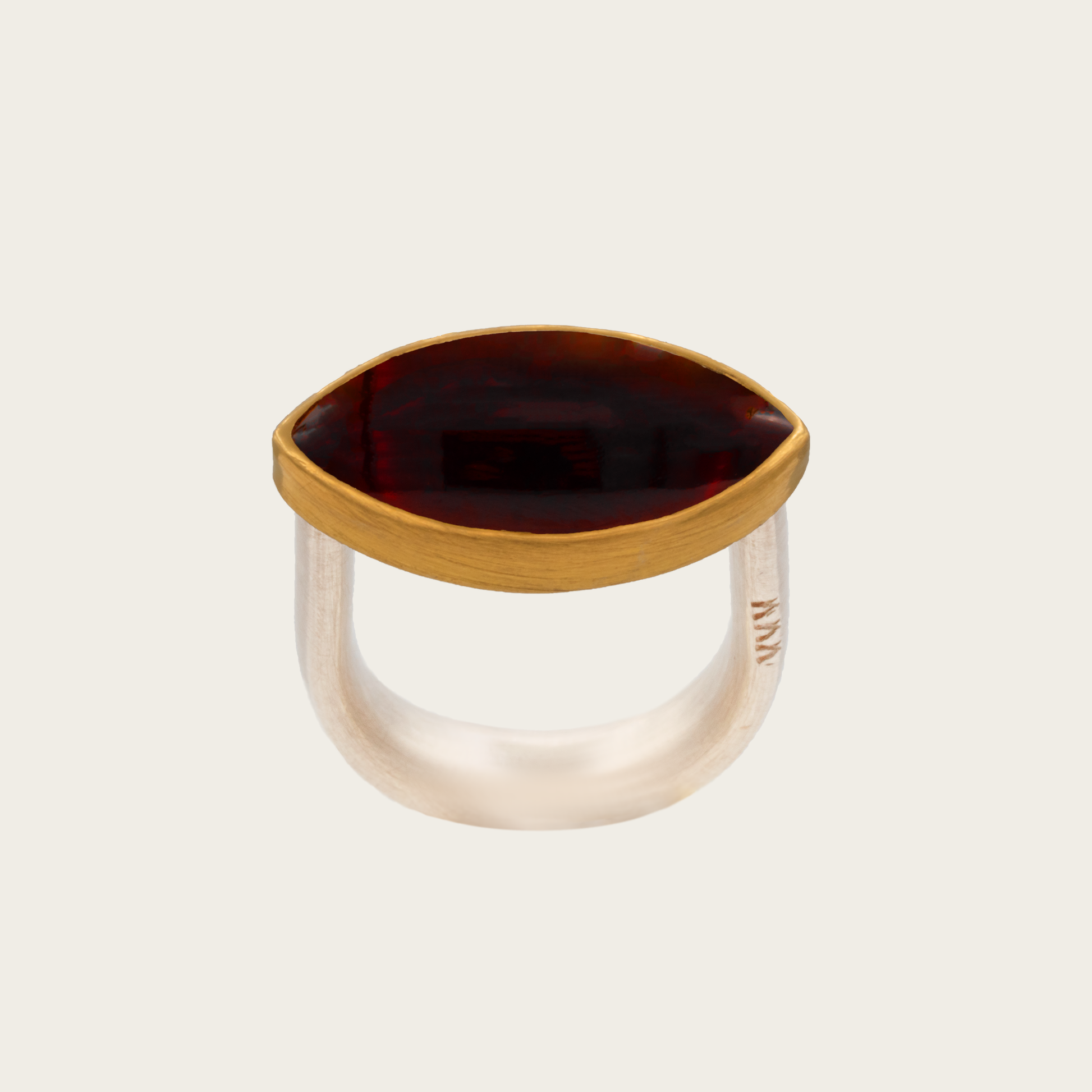 Der Granat zeigt ein tiefes, warmes Rot mit natürlicher Tiefe und feinem Glanz. Er steht für Stärke und Leidenschaft und verleiht dem Ring eine besonders ausdrucksstarke, intensive Ausstrahlung.