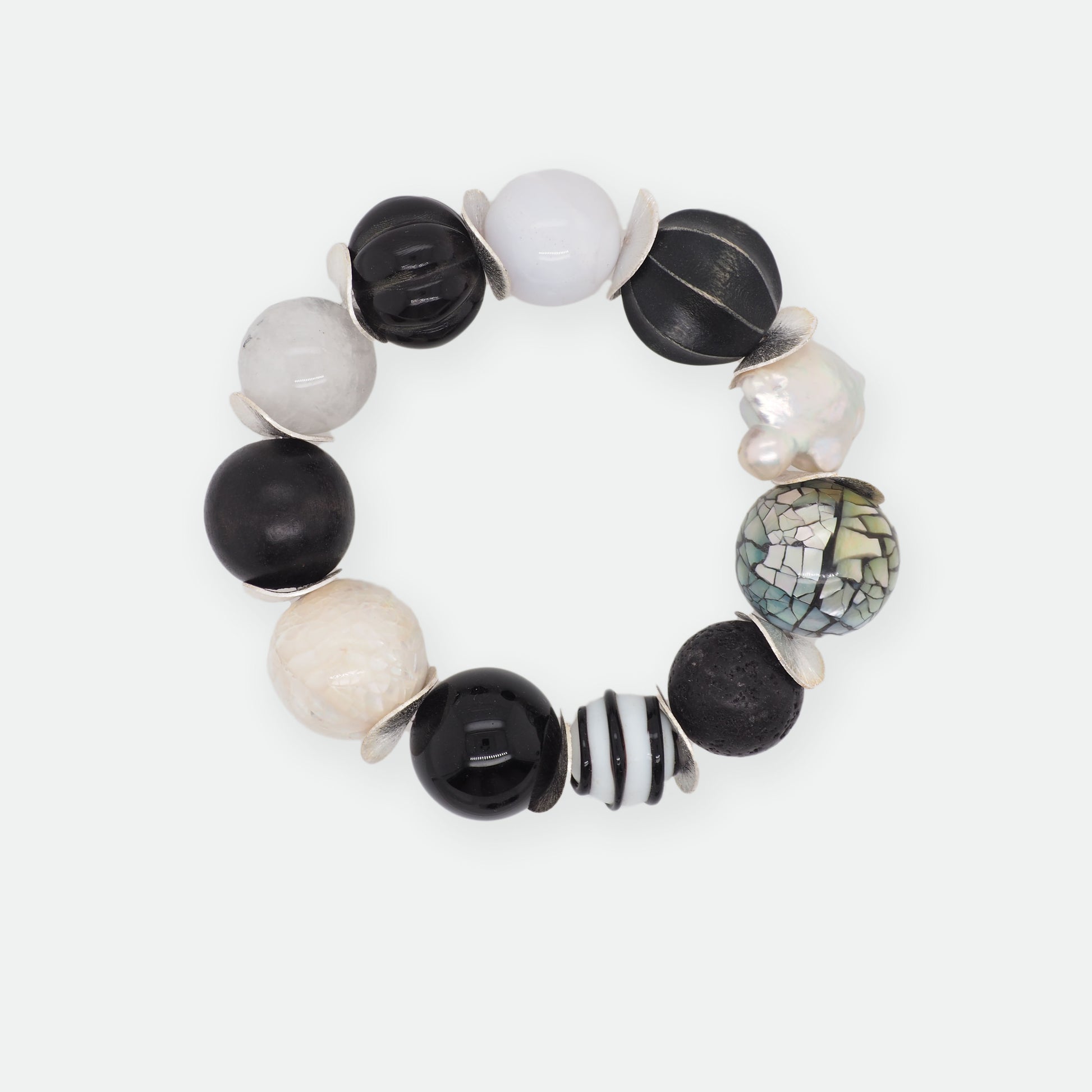 Das Statement-Armband besteht aus Murano-Glas, Holz, Steinen, Polarisperlen und 925er Silber Zwischenelementen.