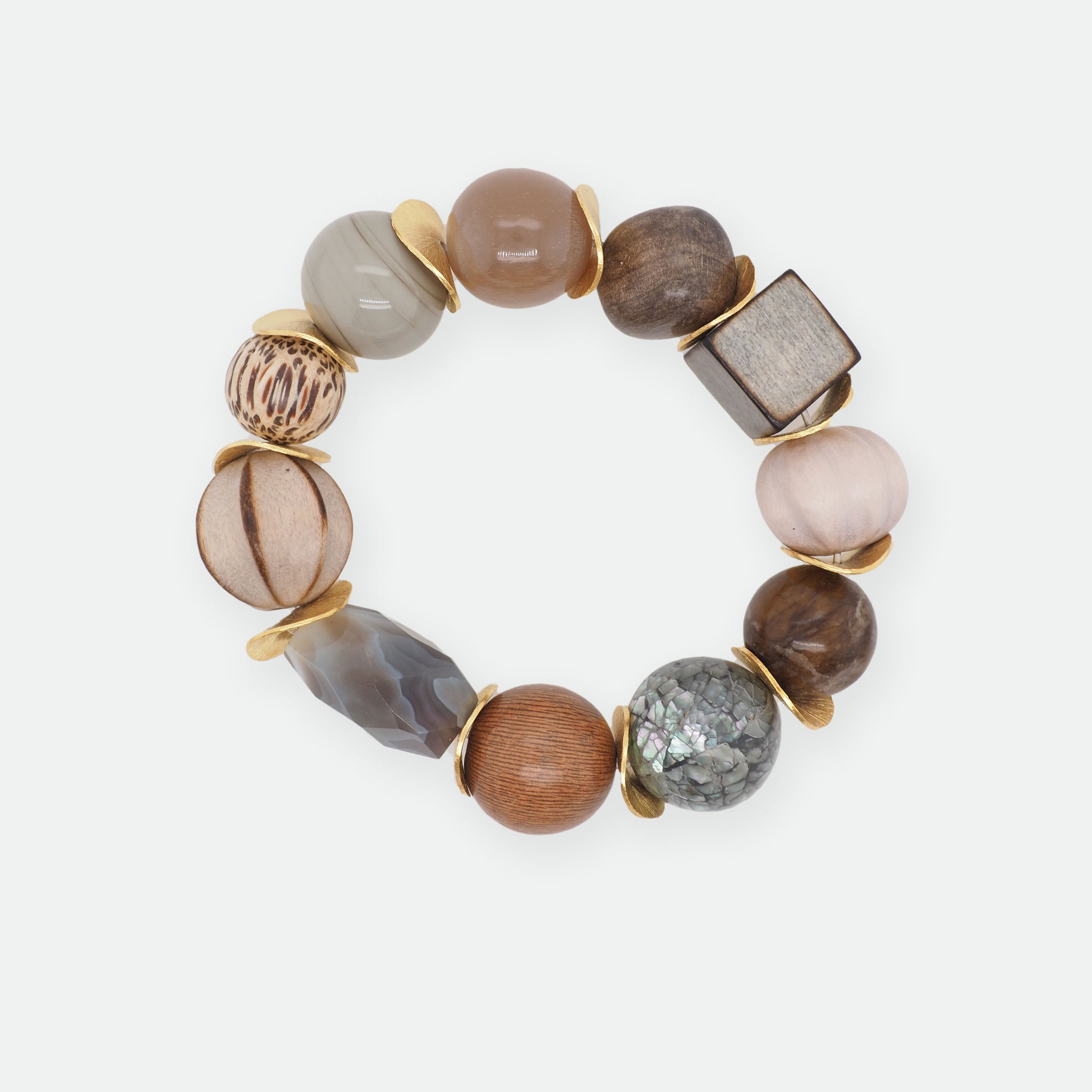 Das Statement-Armband besteht aus Murano-Glas, Holz, Steinen, Polarisperlen und 925er Silber, 24kt vergoldeten Zwischenelementen.