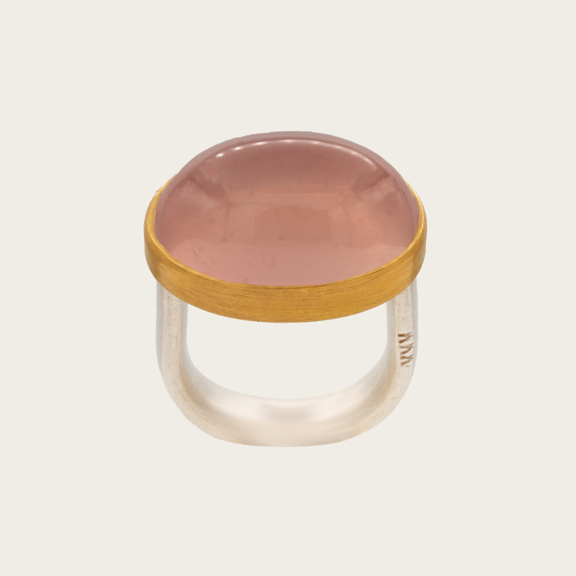 Der Rosenquarz zeigt ein zartes Rosé mit sanft milchiger Transparenz. Er gilt als Stein der Harmonie und verleiht dem Ring eine weiche, feminine Ausstrahlung.