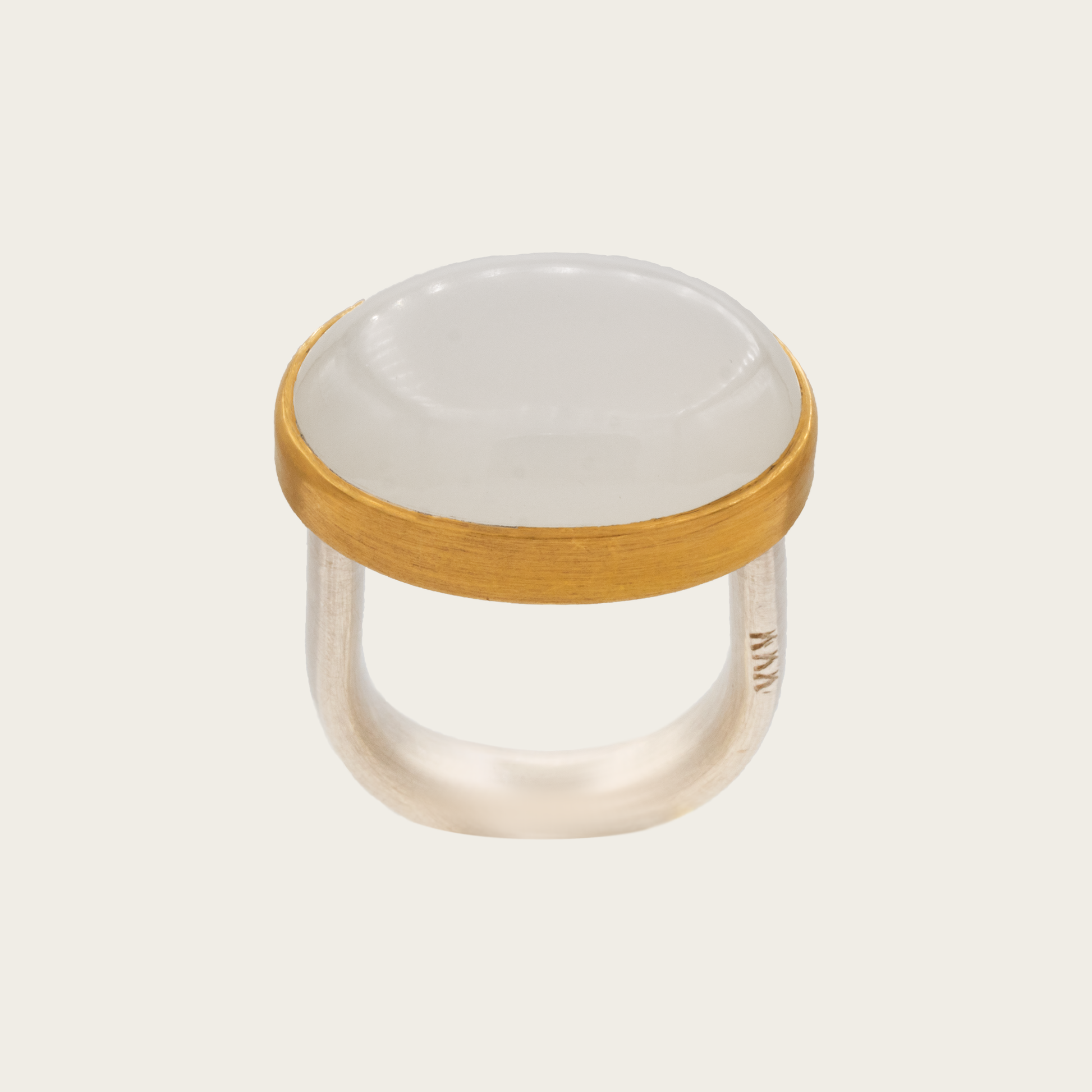 Der Ring der Designerin Karin Kolster-Kelly verbindet klare Linien mit einer eleganten Zweifarbigkeit aus Silber und goldfarbener Fassung. Sein minimalistisches Design setzt den Stein besonders wirkungsvoll in Szene.
